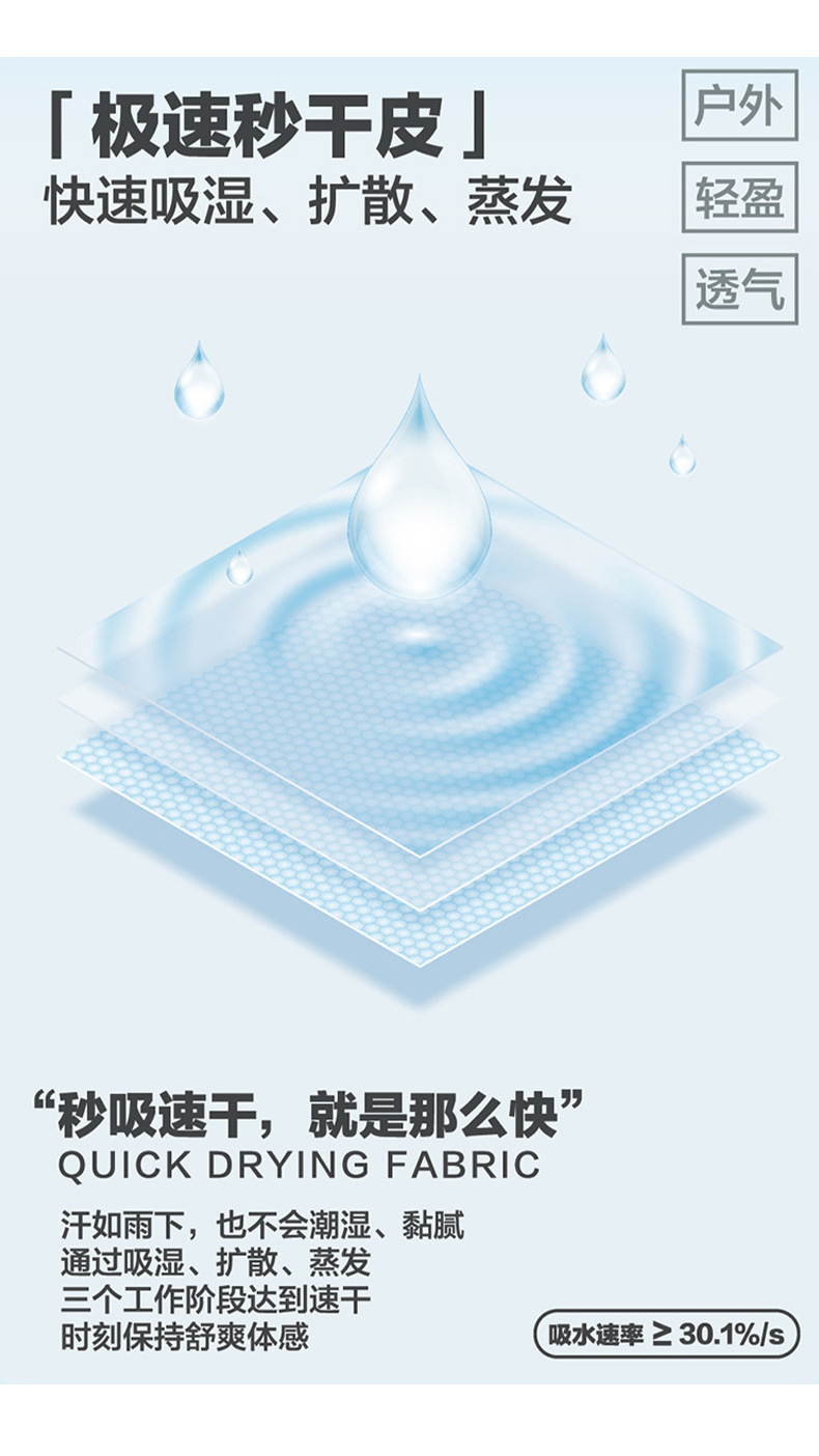 吸湿速干:吸水速度媲美纯棉,汗液扩散蒸发效率提升2倍,保持肌肤持久干爽。